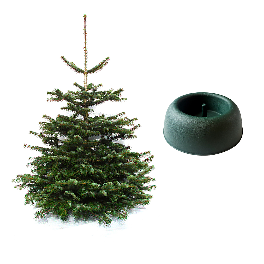 Diese 100-120cm hohe Weihnachtsbaumland® Nordmanntanne wird mit einem Mini-Baumständer geliefert. Das Aufstellen erfolgt mühelos und in Sekunden: Stecken Sie dafür den Dorn in das von uns vorgebohrte Loch am Stamm und stellen Sie danach den Baum auf, fertig! Der Weihnachtsbaumland® Christbaum ist ohne zusätzliche Einstellung gerade und standsicher. Zur längeren Haltbarkeit des Baumes kann der Ständer mit bis zu 0,5 Litern Wasser befüllt werden. Christbaumständer aus 100% hochwertigem grünen Recyclingkunststoff mit Stahlaufnahmedorn. Standsicher für Bäume bis 1,5 m, Wasseraufnahme max. 0,5 Litern, Durchmesser 23 cm, maximaler Stammdurchmesser bis 12 cm, Eigengewicht 0,3 kg.