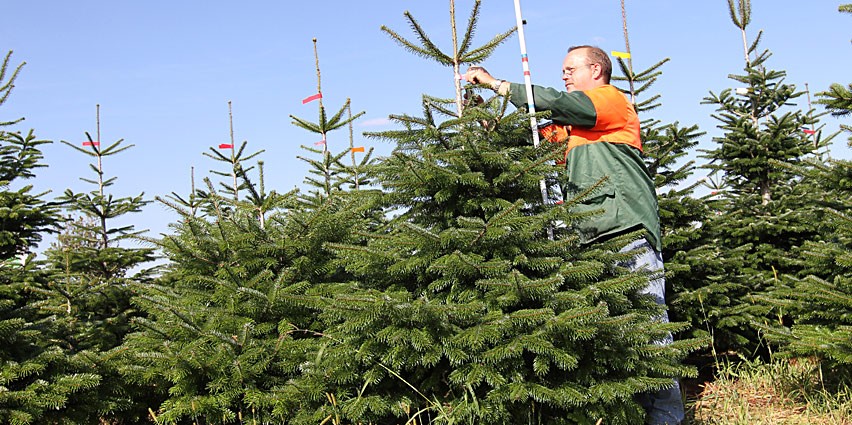Um einen erstklassigen Christbaum zu erhalten, investieren wir viel Zeit und Arbeit in die Pflege der Bäume. Ab dem dritten Standjahr werden die Bäume jährlich in Form geschnitten, um den pyramidenartigen Wuchs sicherzustellen. Zudem müssen die Bäume unterjährig von Unkraut befreit. Dies wird hauptsächlich mit Freischneidern und Mähern durchgeführt. Ab dem fünften Standjahr werden die unteren Astkränze der Bäume entfernt, um die Belüftung der Christbäume zu fördern. Im Herbst werden die Bäume für das nächste Weihnachtsfest ausgewählt. Für Weihnachtsbaumland.de werden nur 1-A Bäume aus den Feldern ausgesucht. Besonders wichtig sind ein dichter Wuchs sowie eine gleichmäßige pyramidenartige Form.